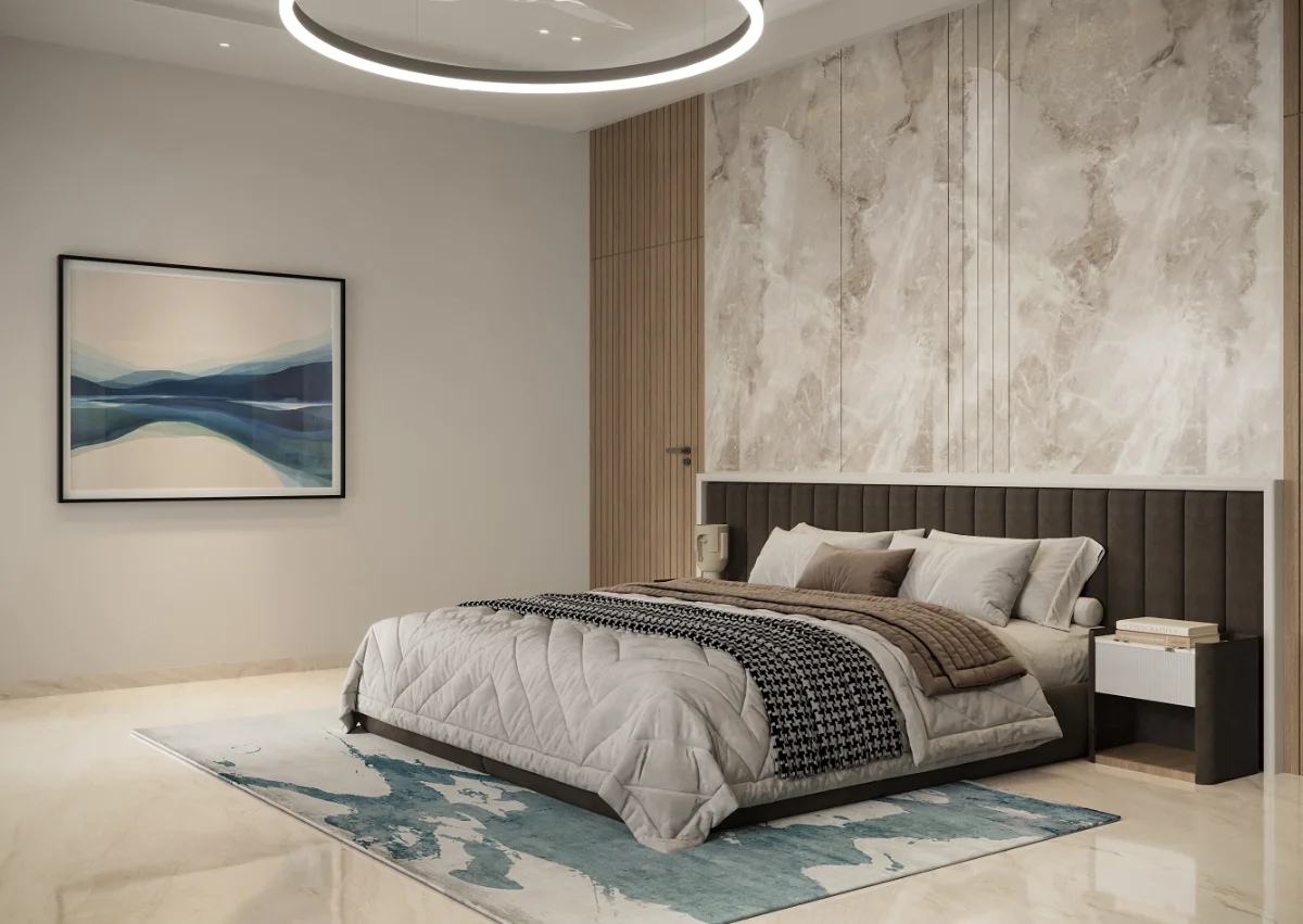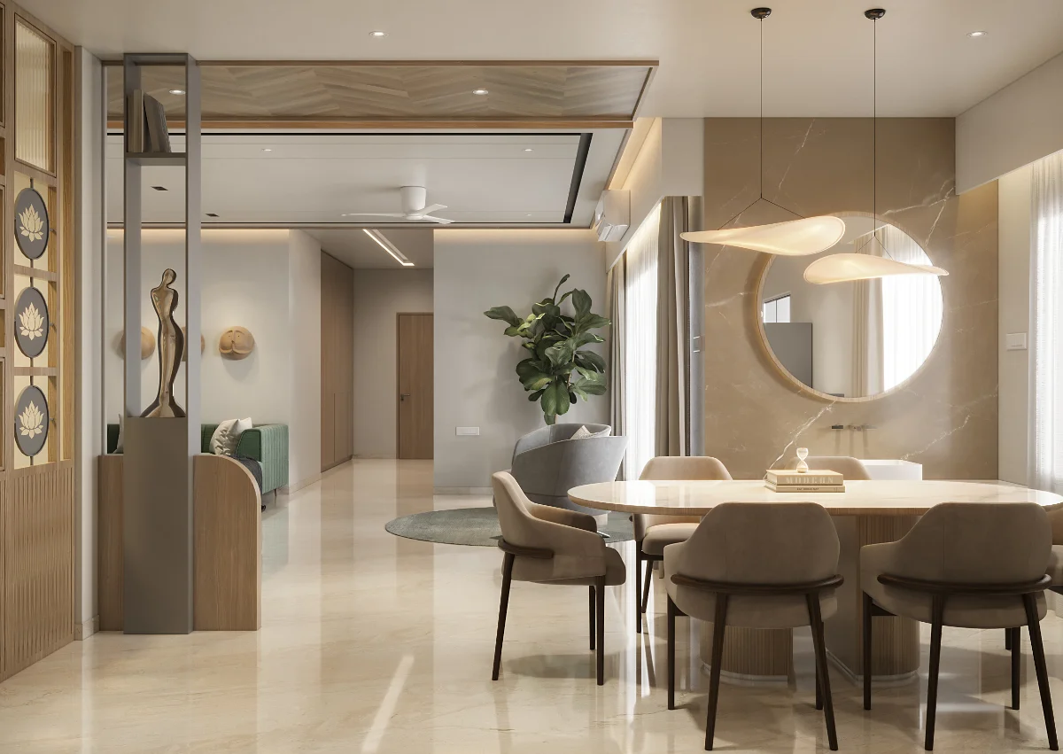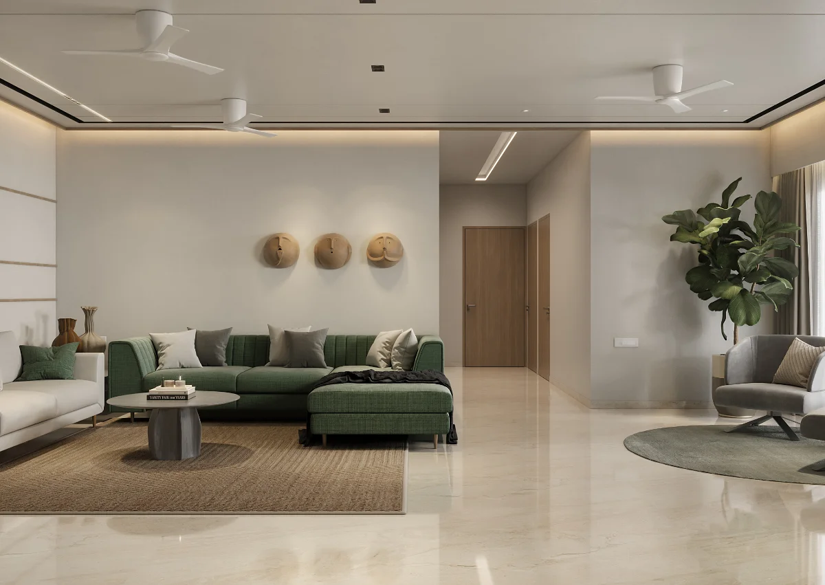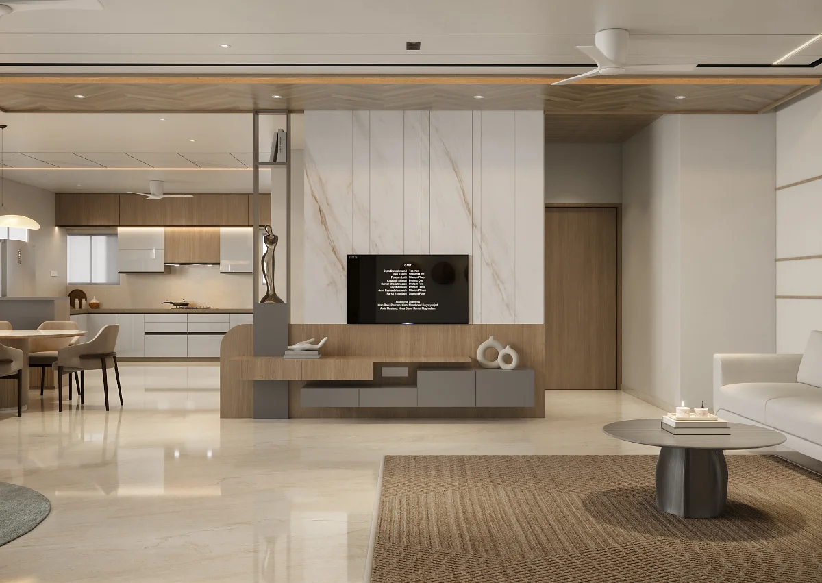 The interior of this 3BHK flat is designed for comfort and functionality with a spacious layout. It includes three bedrooms, one of which serves as a guest room. The master bedroom comes with a private balcony, offering a relaxing space. Another bedroom also has balcony access, ensuring fresh air and natural light. The living area and kitchen are well-planned, providing a perfect setup for daily living.