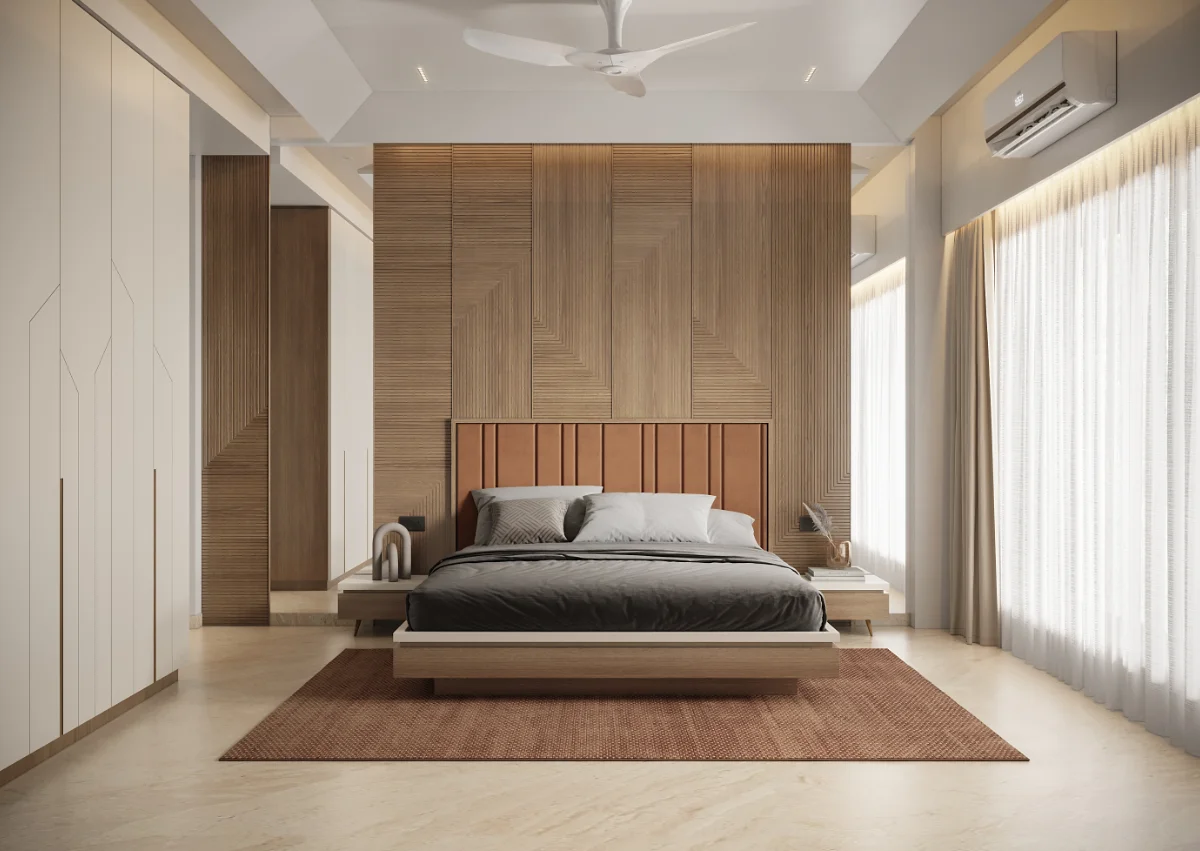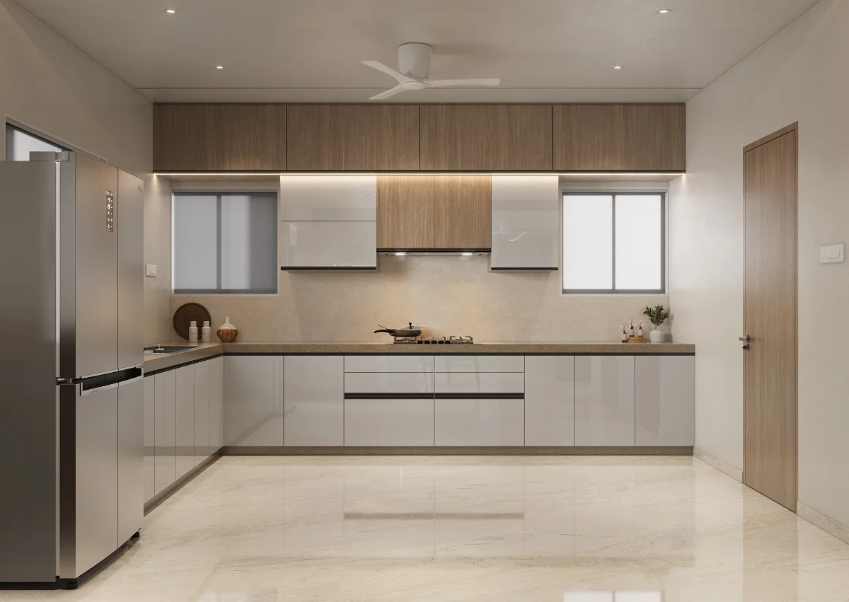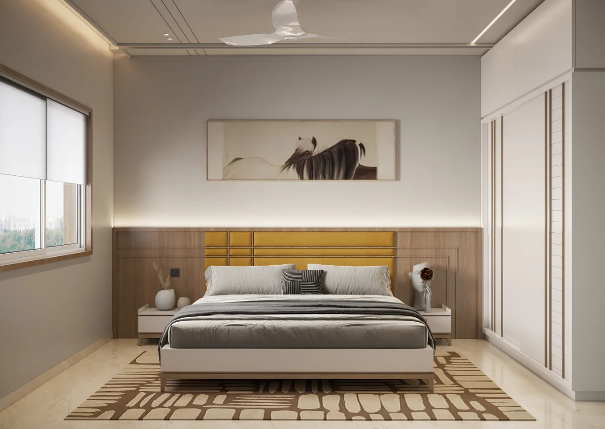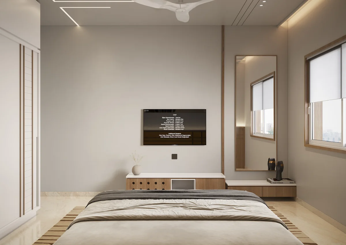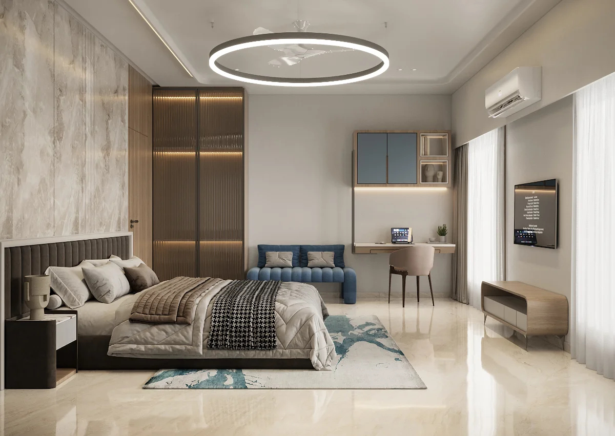 The interior of this 3BHK flat is designed for comfort and functionality with a spacious layout. It includes three bedrooms, one of which serves as a guest room. The master bedroom comes with a private balcony, offering a relaxing space. Another bedroom also has balcony access, ensuring fresh air and natural light. The living area and kitchen are well-planned, providing a perfect setup for daily living.