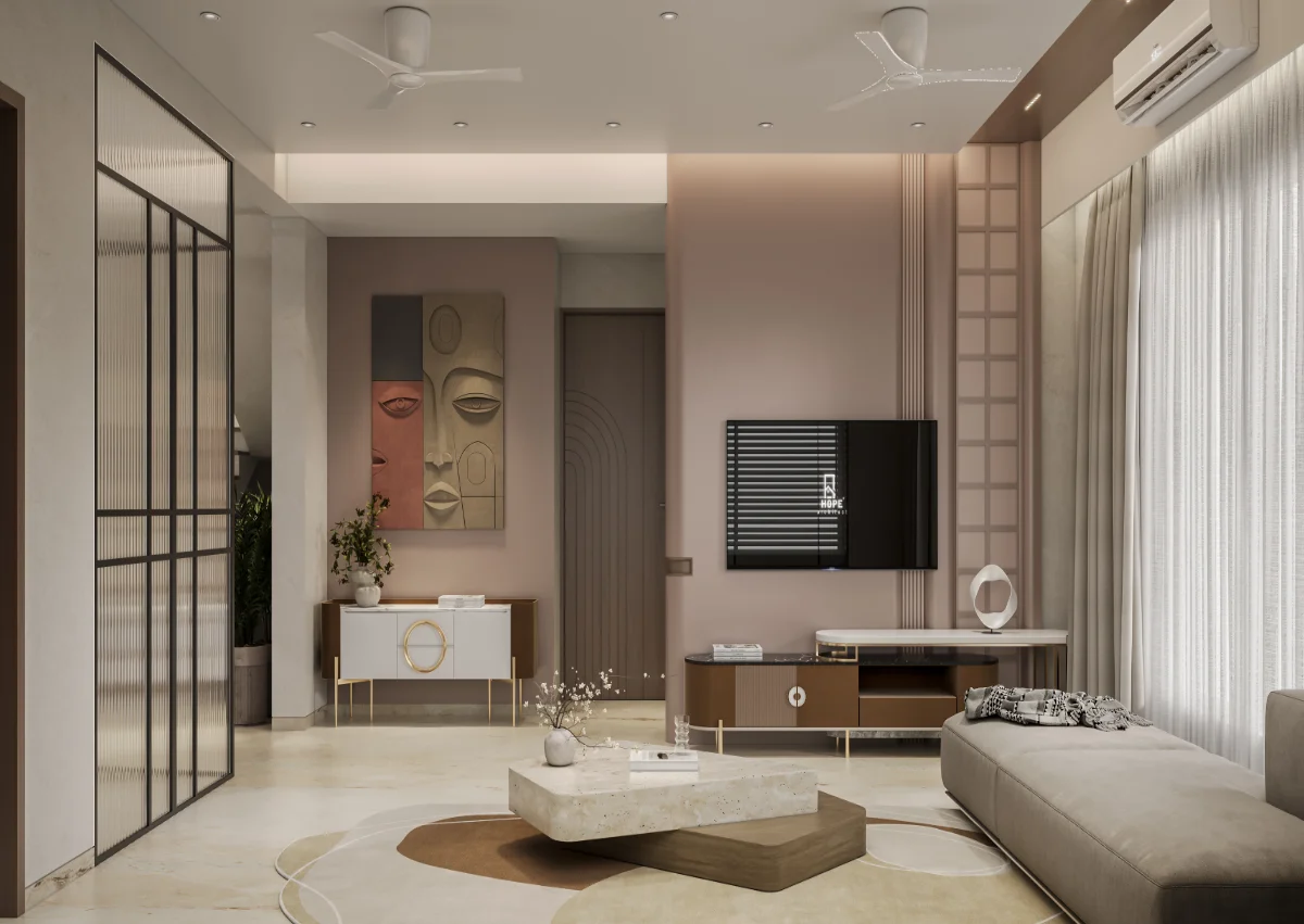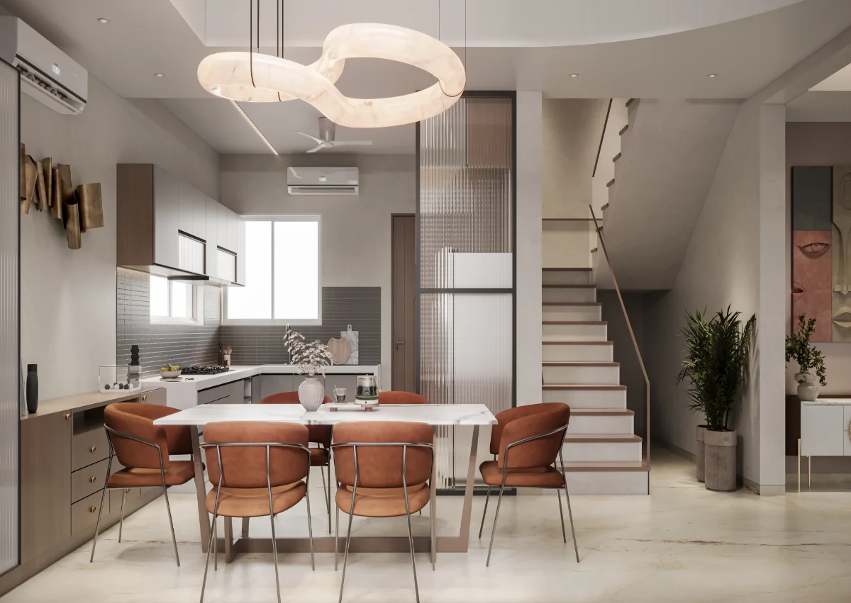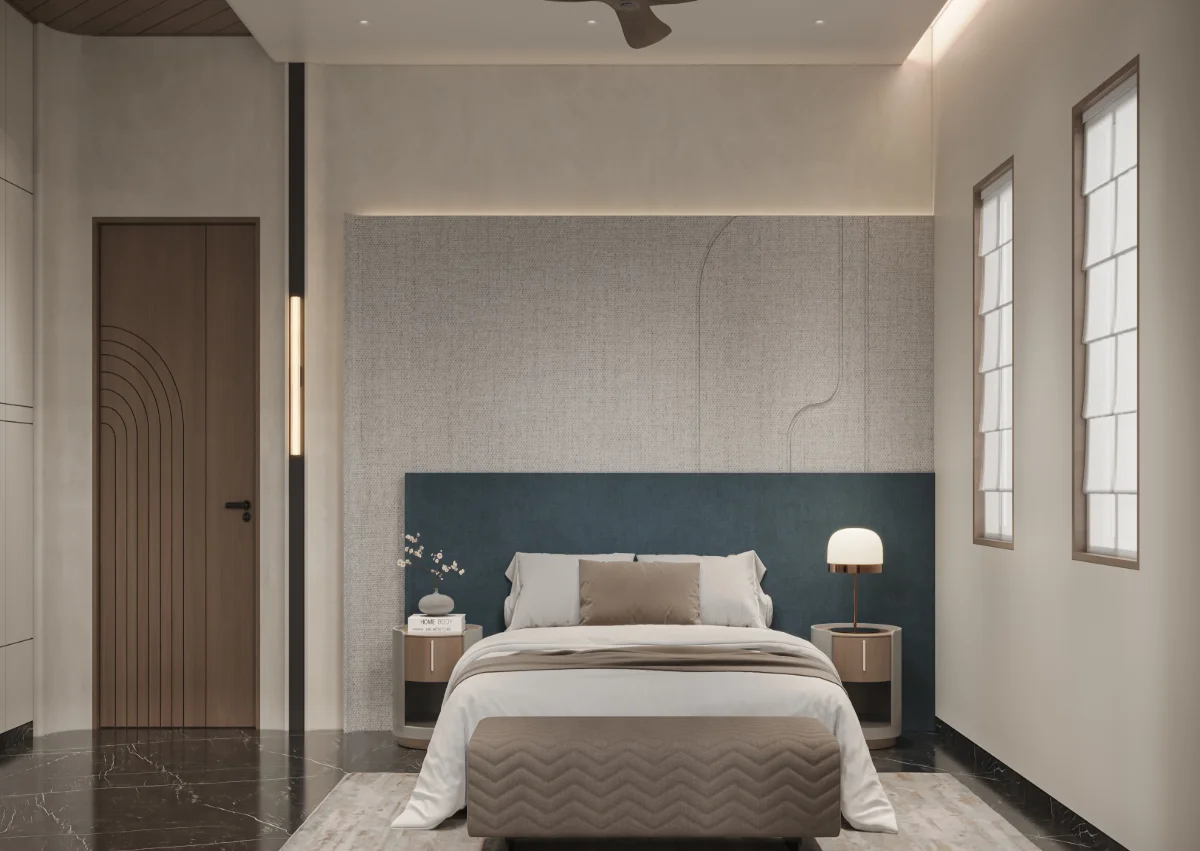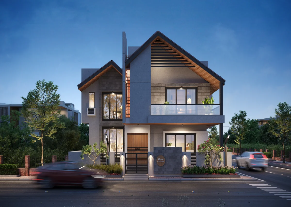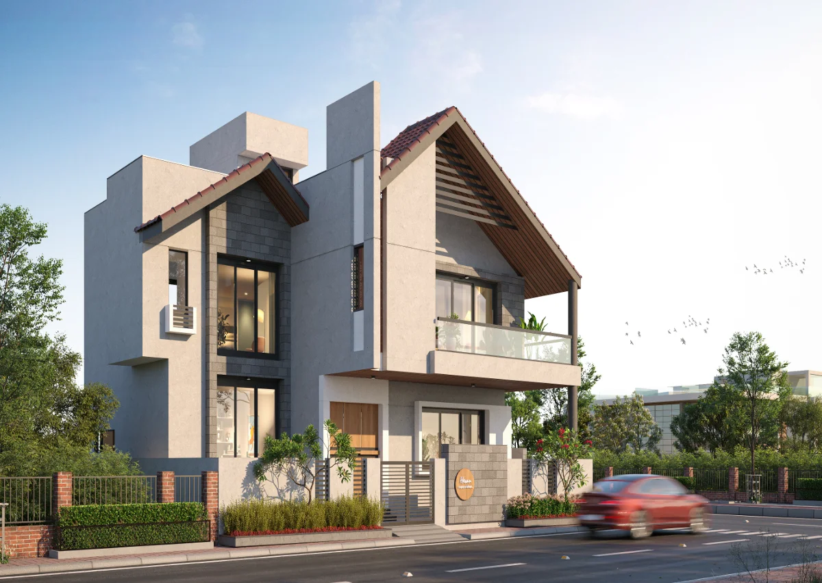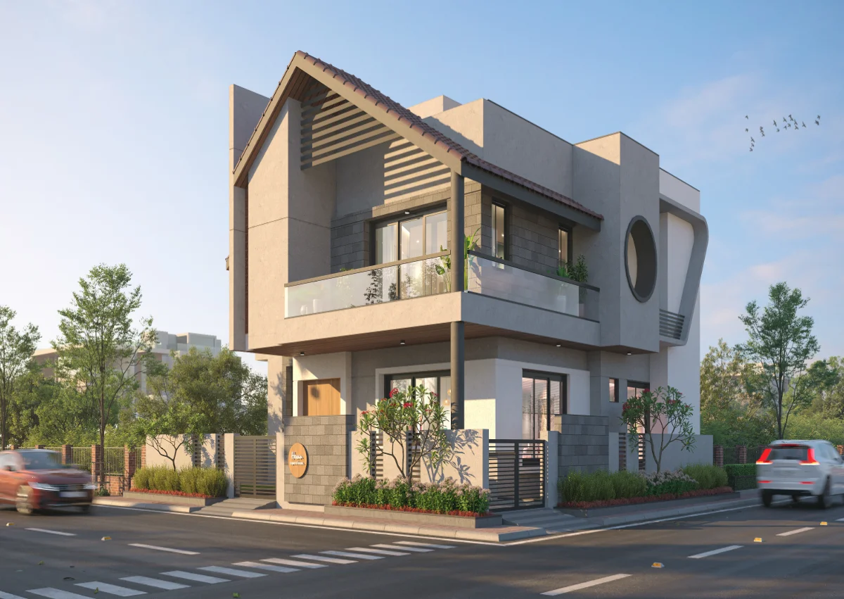 A simple and retro style house structure has been prepared by giving a roofed elevation of a modern bungalow with a plot area of 1978 sq.ft. In which 4 bedrooms, kitchen and master living have been built in which the dining area has been built in double heigh A teacher’s family whose simple requirement is to design a bedroom with a master toilet in each bedroom with an attached balcony.