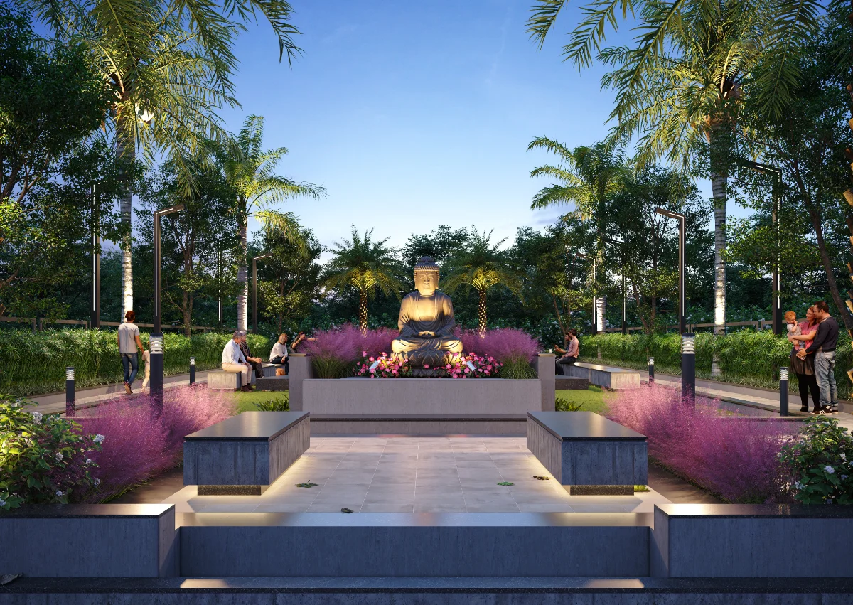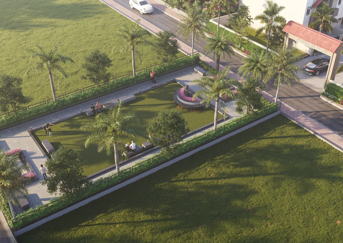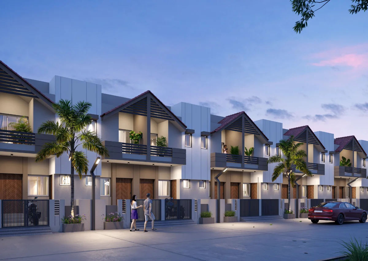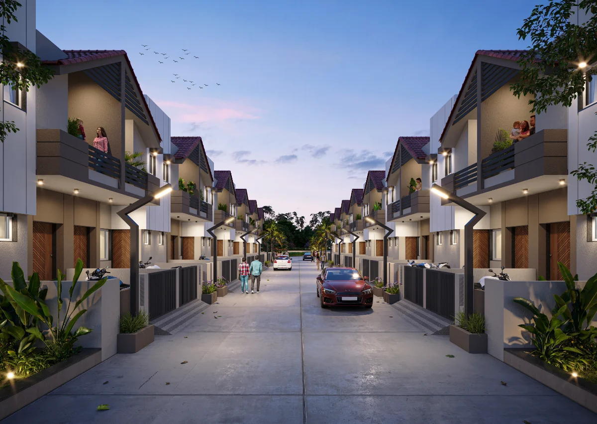 This well-planned row house project features 20 houses facing another 20 houses, each built on a 645 Sq.Ft. plot area. Every house includes a small open space at the front, a living room, kitchen, and one bedroom on the ground floor, with two additional bedrooms on the first floor. The project also offers a big garden and comfortable seating space, creating a pleasant atmosphere for relaxation and community gatherings.