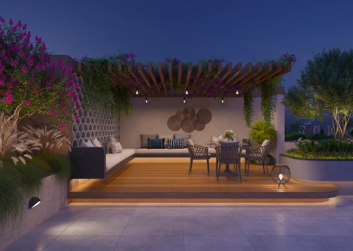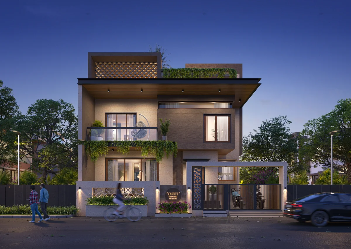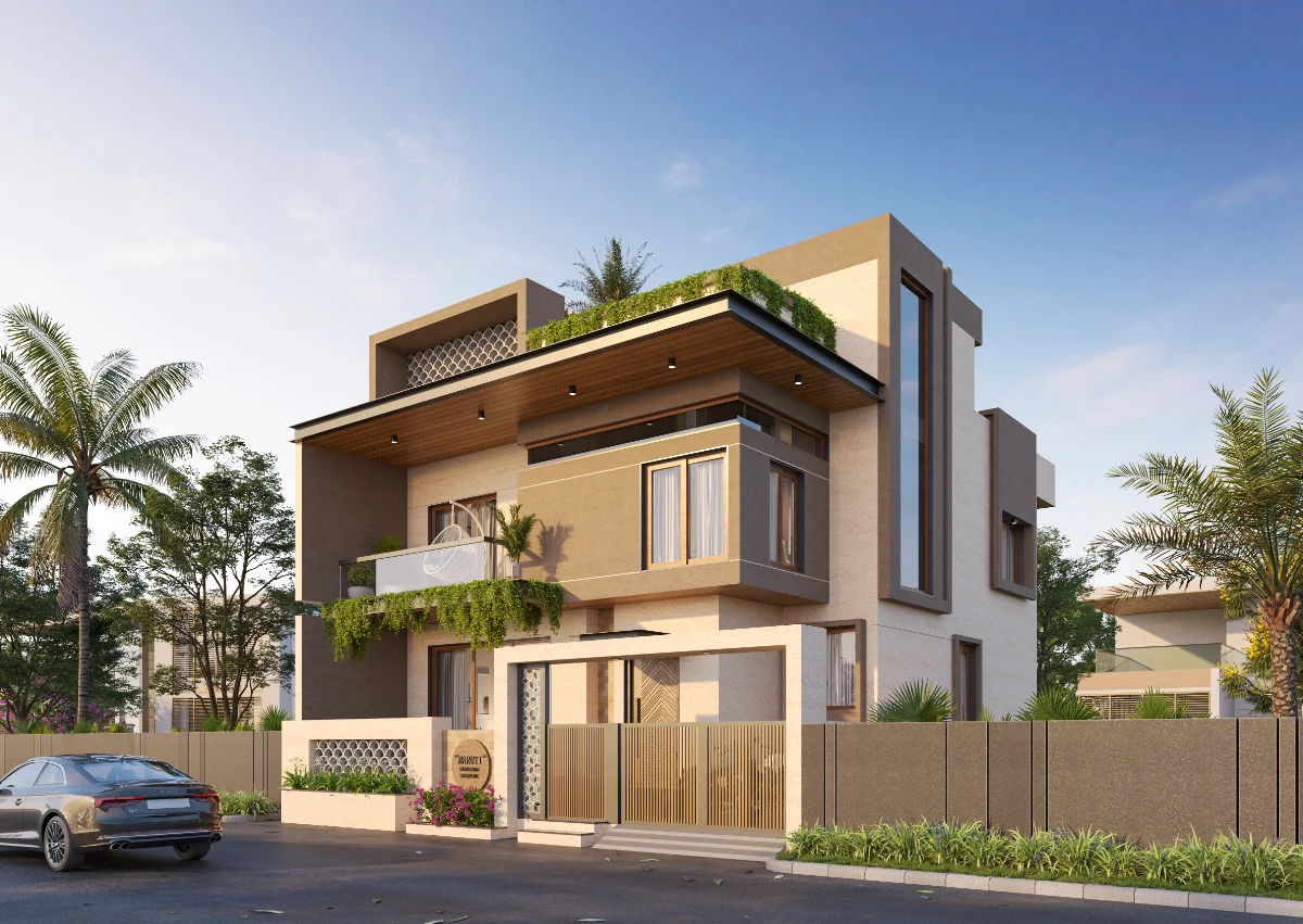 This 2091 Sq.Ft. bungalow is designed with a smart and appealing exterior that combines functionality with comfort. The layout includes a well-planned landscape area, spacious parking space, and a dedicated gym area. The bungalow features four bedrooms, a living room, and a functional kitchen, offering ample space for family living. The overall design provides a modern and balanced look with practical use of space.