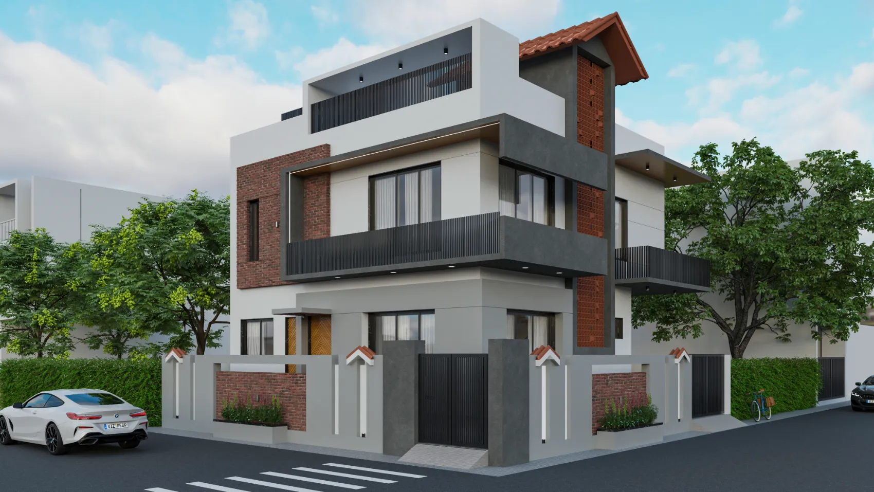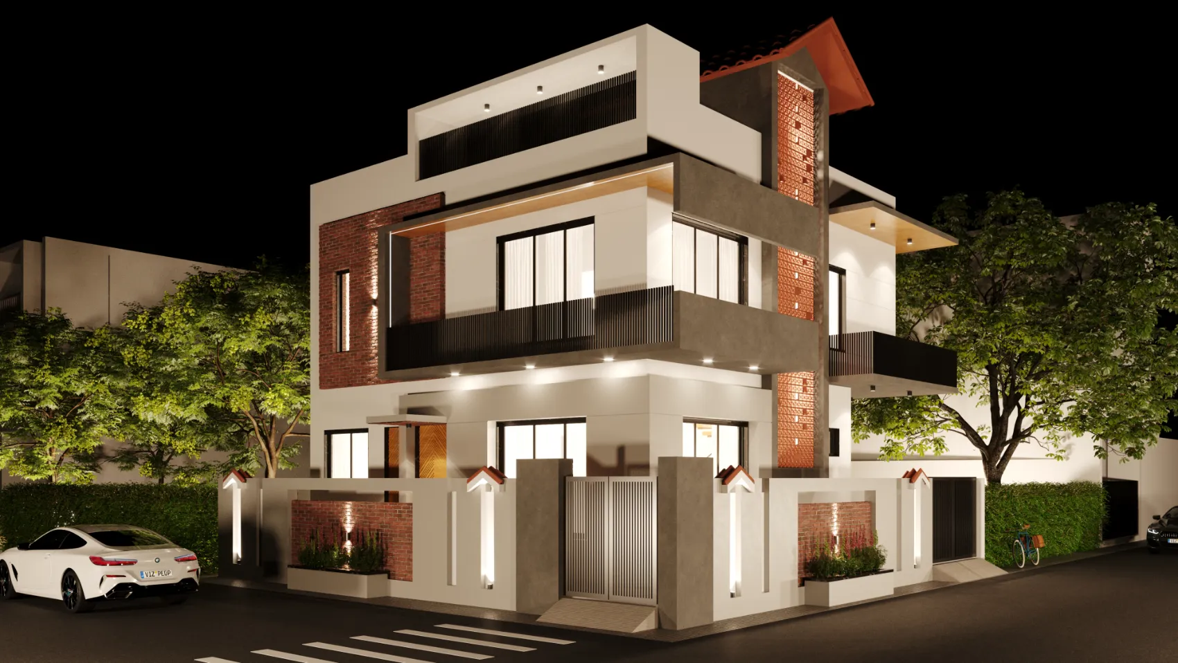 This house was very important to us because it was only the second year of Hope Architects so there was an enthusiasm and passion for the work to do something different in the projects. In which ventilation, light and garden view from the living room were designed. By which we get better and bigger projects in the future. The plot size of this bungalow was only 40' by 40' in which air can be circulated from the terrace from the far side. Inside this building, the client hoped that if the car is parked, the sun should not fall on it So we kept the parking on the North West side in which the wall of the west side was kept 11' and 5' hanging balcony. So the parking is covered.