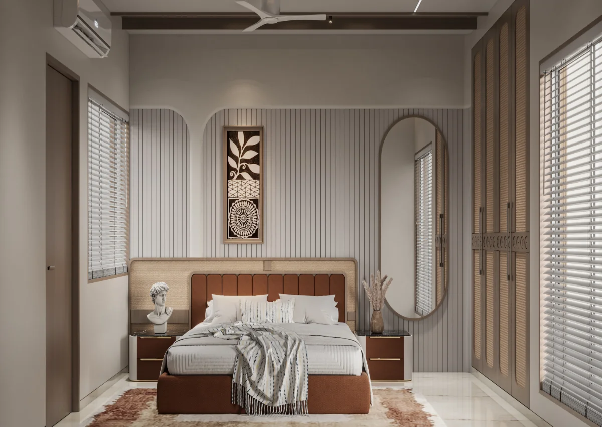 A simple and retro style house structure has been prepared by giving a roofed elevation of a modern bungalow with a plot area of 1978 sq.ft. In which 4 bedrooms, kitchen and master living have been built in which the dining area has been built in double heigh A teacher’s family whose simple requirement is to design a bedroom with a master toilet in each bedroom with an attached balcony.