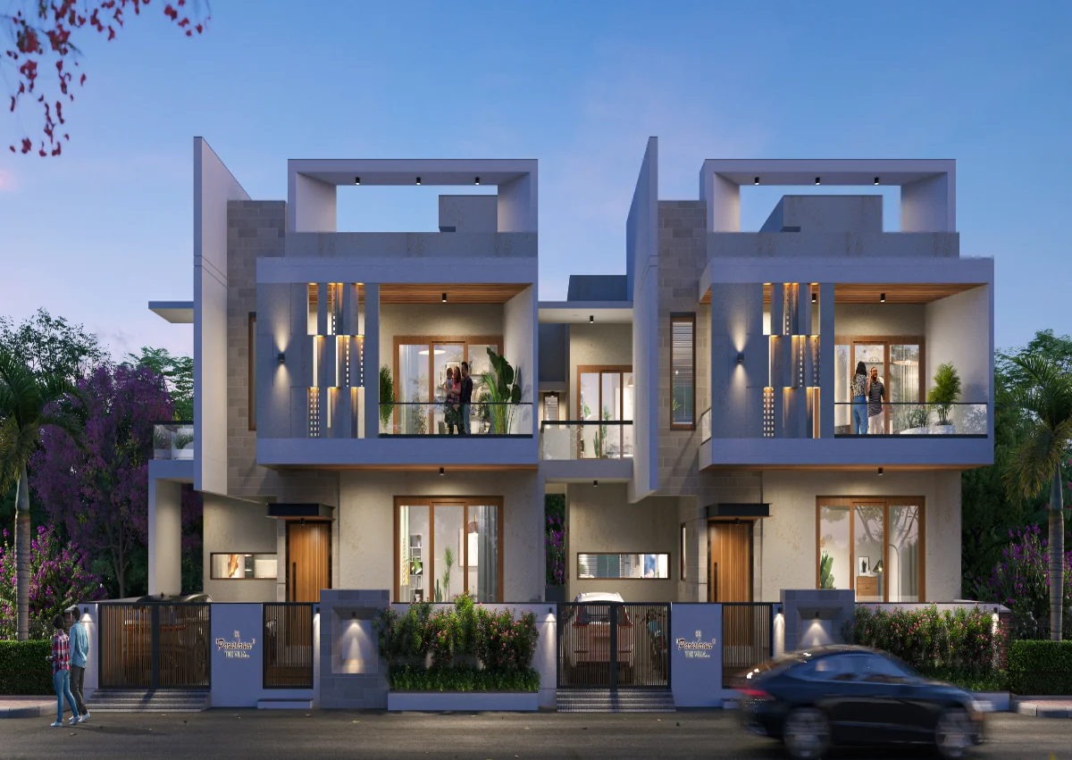 These two bungalows are designed on 1924.5 Sq.Ft. per each plots with a perfect blend of modern and contemporary style. The exterior features clean lines, spacious balconies, and elegant wall textures. The design includes a landscaped garden, parking area, well-planned kitchen, and dining space. Each bungalow offers a master bedroom with a balcony, along with parents' and children's bedrooms for comfortable family living. The overall look reflects a premium, stylish, and functional home.