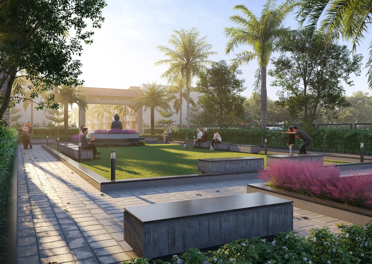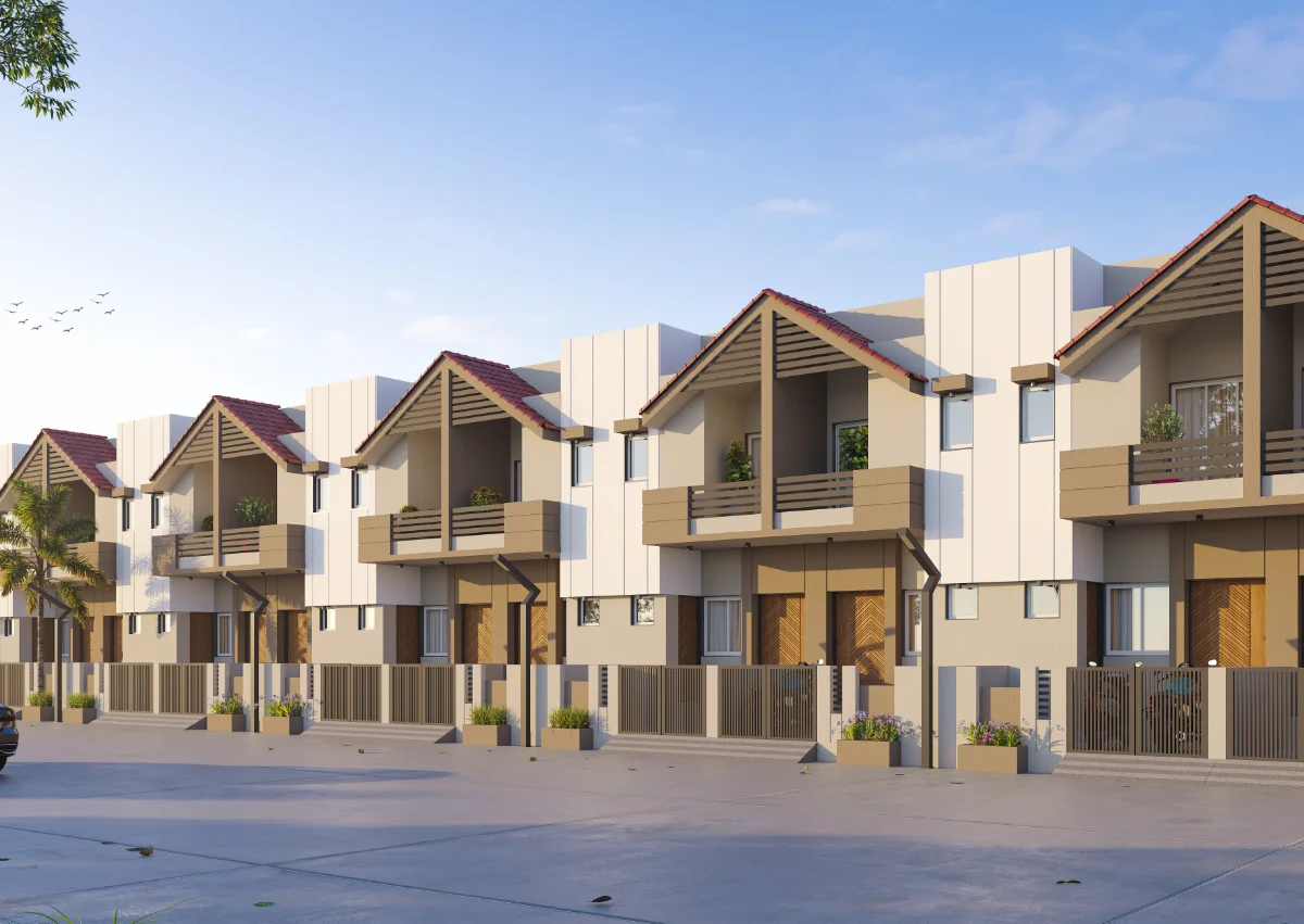 This well-planned row house project features 20 houses facing another 20 houses, each built on a 645 Sq.Ft. plot area. Every house includes a small open space at the front, a living room, kitchen, and one bedroom on the ground floor, with two additional bedrooms on the first floor. The project also offers a big garden and comfortable seating space, creating a pleasant atmosphere for relaxation and community gatherings.